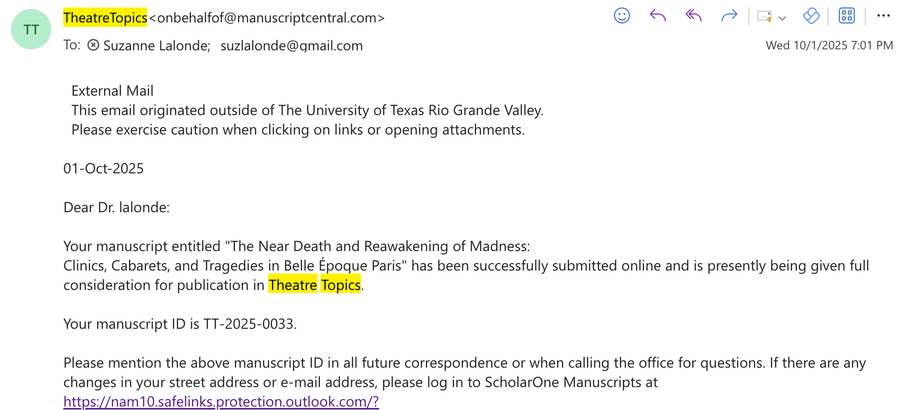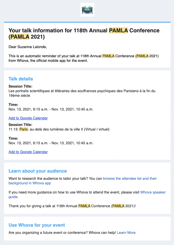 - LaLonde, Suzanne. Pacific Modern Language Association Convention–Las Vegas, NV, virtual, 11/2021, French and Francophone Special Session on Paris: “Briquet, Charcot, Janet, Freud, et Zola: Les portraits scientifiques et littéraires des souffrances psychiques des Parisiens à la fin du dix-neuvième siècle”