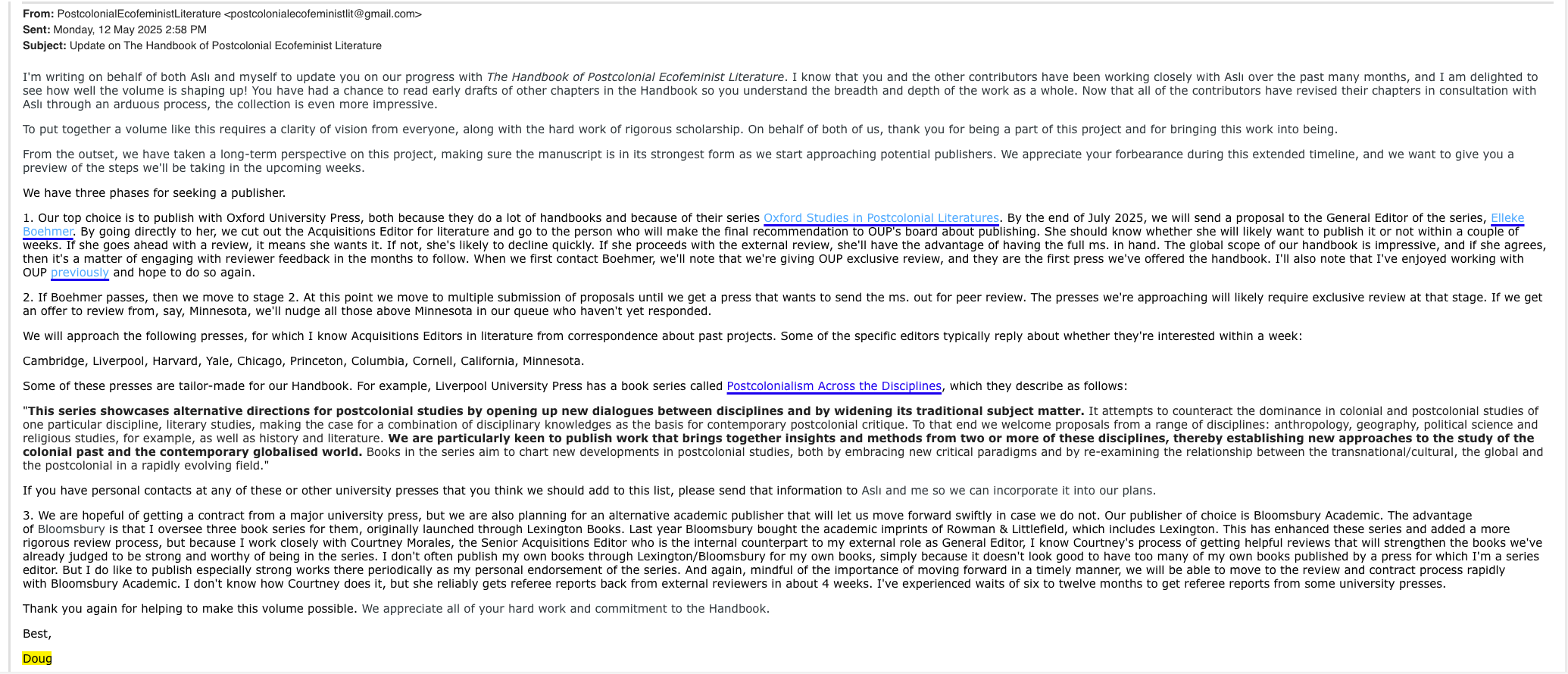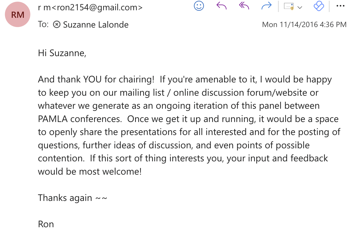 - LaLonde, Suzanne. Pacific Modern Language Association Convention–Pasadena, CA, 11/2016, Eco-criticism Session Organizer and Chair: “Teaching for the Post-Anthropocene”