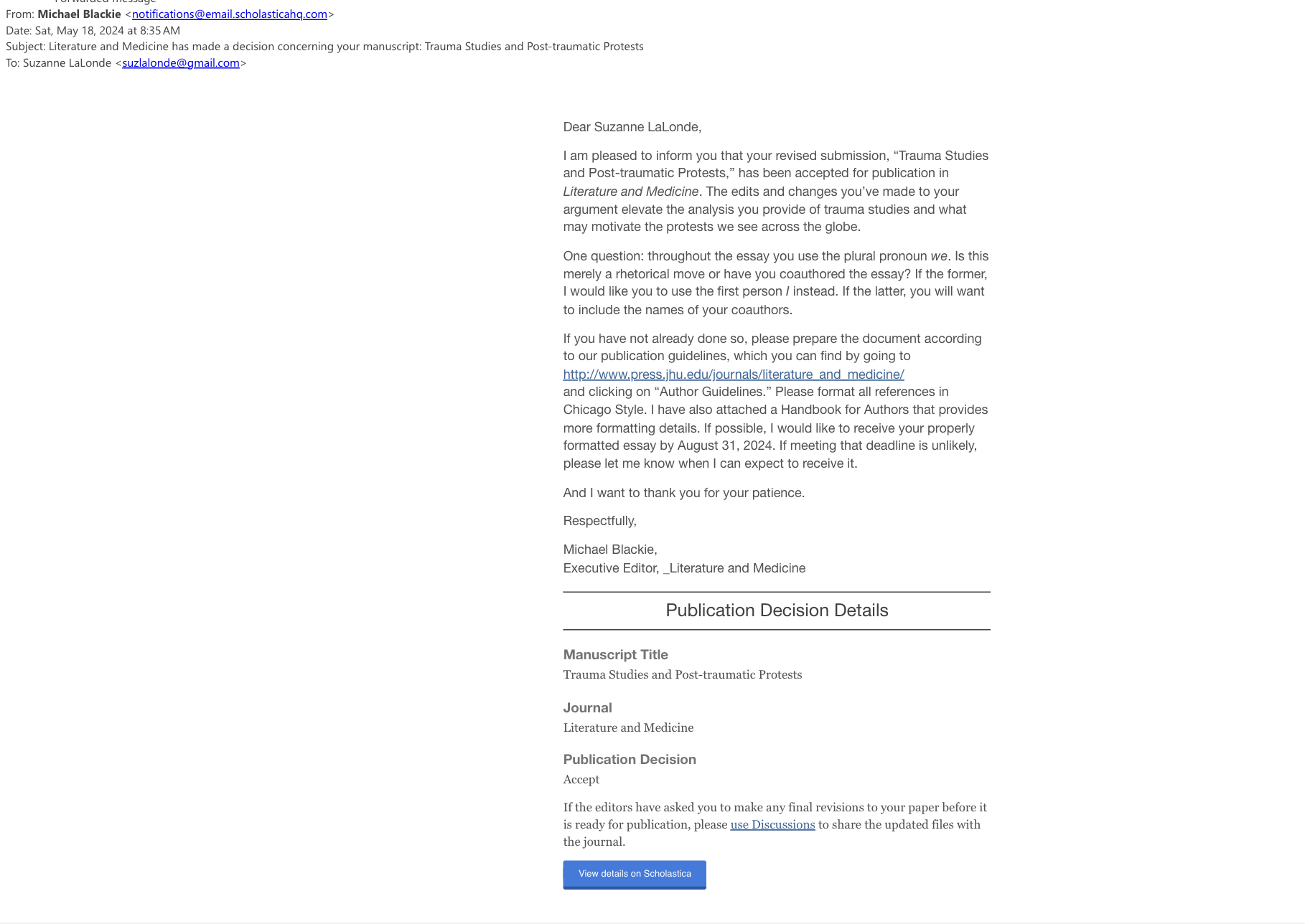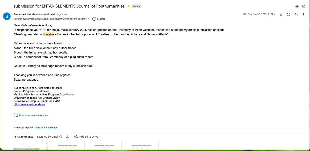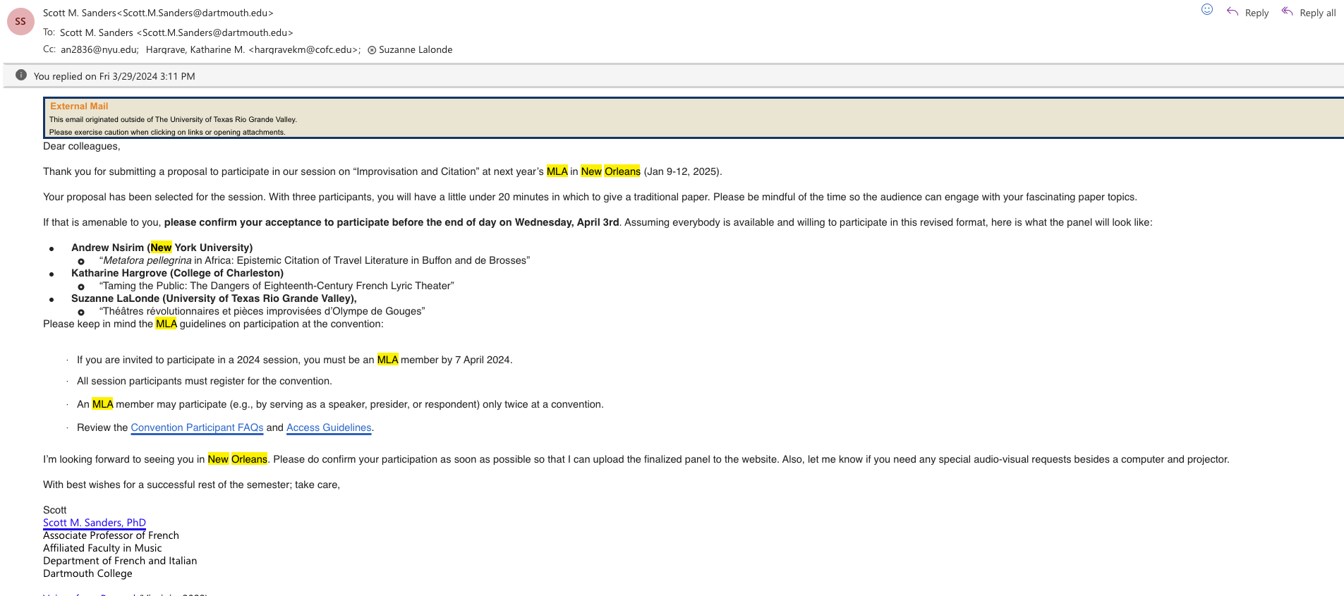 - LaLonde, Suzanne. Modern Language Association Annual Convention, New Orleans, 01/2025, Eighteenth Century French Literature Session: “Théâtres révolutionnaires et pièces improvisées d’Olympe de Gouges"